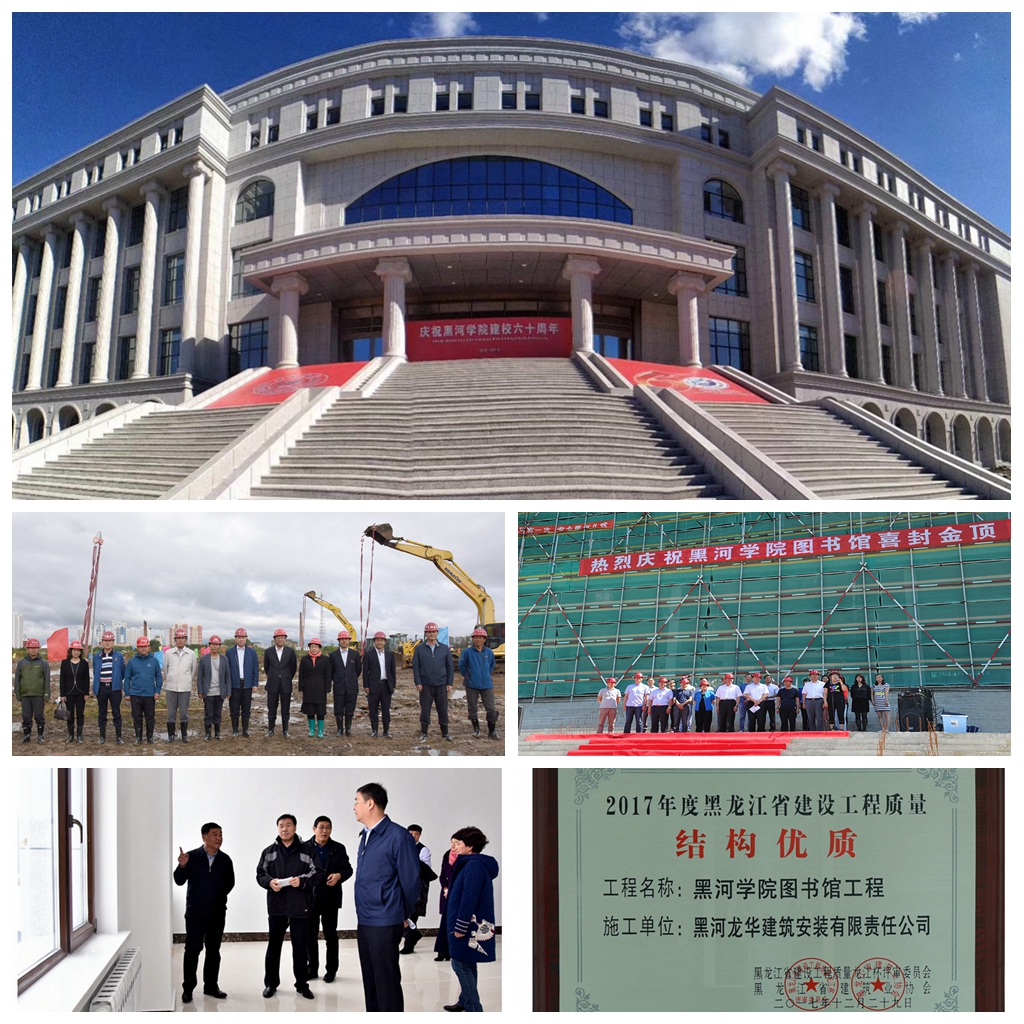 黑河学院图书馆工程是学校“十三五”规划重点建设项目,于2016年9月16日开工建设,建筑面积20897.54平方米,地上五层,建筑高度23.2米。该工程自开工建设以来,学校党委、行政十分重视,校领导多次亲临施工现场调查研究、决策部署有关工作。各相关部门也参与反复深入地研讨,对图书馆建设工作给予了极大地关注和指导,保证了项目建设的质量和效果。2017年6月,黑河学院图书馆工程荣获黑龙江省主体结构施工最高奖项——“黑龙江省结构优质工程”,该奖项也是黑河市近年来在建工程中的最高奖项,同年该项目还获得了黑河市“建设工程项目施工安全生产标准化工地”称号。新图书馆的顺利竣工将进一步改善学校的硬件设施和办学条件,极大提升了学校文化品位和内涵。